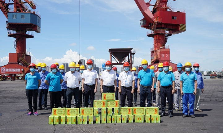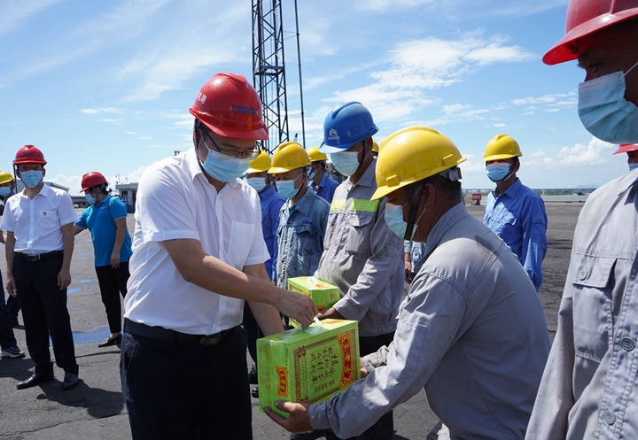 7月14日,集團(tuán)黨委委員、副總裁、工會(huì)主席楊超燦率隊(duì)到集團(tuán)下屬港口經(jīng)營公司碼頭作業(yè)現(xiàn)場(chǎng)、中油王港公司庫區(qū)、博賀新港區(qū)重點(diǎn)項(xiàng)目施工現(xiàn)場(chǎng)等處“送清涼”,為奮戰(zhàn)一線的職工發(fā)放防暑降溫飲品、用品。