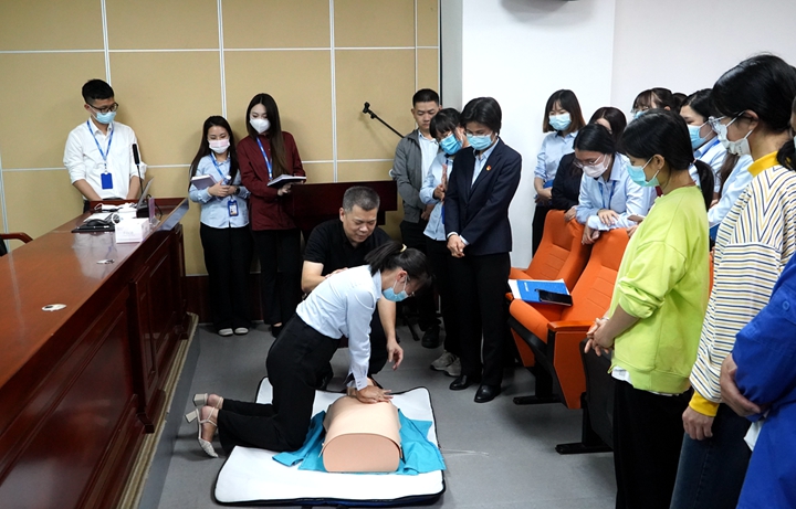 講座采用理論授課及實踐操作相結合的方式進行,梁宇強以生活中的案例為切入點,對創(chuàng)傷、中毒、溺水、心跳驟停、氣道異物的癥狀及急救技術作了詳細的講解,并鼓勵大家當成為突發(fā)意外或傷病“第一目擊者”時,實施正確有效的急救方法,為傷病者提供第一時間的救助,贏得寶貴搶救機會的黃金時間。理論授課結束后,梁宇強以模擬橡膠人為器具,現場演示了正確的心肺按壓和人工呼吸方式,并指導職工們親自動手操作。本次講座深入淺出、寓教于樂、實操實練的宣講培訓方式,極大激發(fā)了職工們的學習熱情,贏得了職工們的廣泛好評。