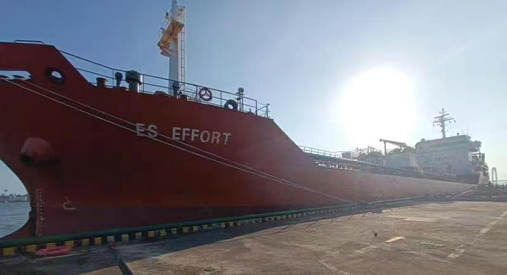 5月28日下午18時10分,裝載有2500噸基礎(chǔ)油的“永海奮進(jìn)”號外輪在碼頭操作人員的精準(zhǔn)引領(lǐng)下順利靠泊中油王港公司碼頭1號泊位,這是三年多來靠泊的首艘外貿(mào)船舶。