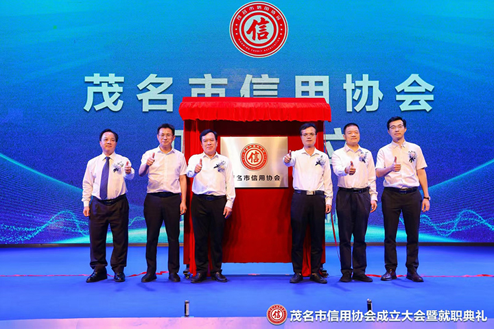 茂名市人大常委會副主任吳海強(右三),茂名市政協(xié)黨組副書記、副主席楊培基(左三),茂名市人民政府副秘書長何江(右二),茂名市發(fā)展和改革局黨組書記、局長朱春保(左二 ),廣東省發(fā)展改革委信用建設(shè)處一級主任科員譚強杰(右一),茂名市信用協(xié)會會長李文(左一)共同為茂名市信用協(xié)會揭牌。