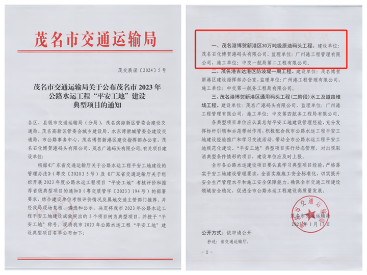1月17日,茂名市交通運輸局公布了茂名市2023年公路水運工程“平安工地”建設典型項目的表彰名單,茂名港集團下屬企業(yè)投資建設的茂名港博賀新港區(qū)30萬噸級原油碼頭工程被評為平安工地建設典型項目,榮獲“平安工地”稱號!