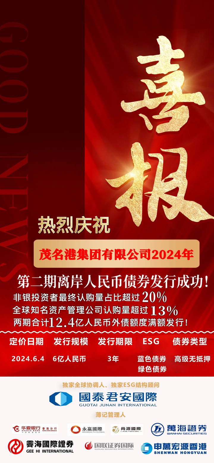 6月4日,茂名港集團有限公司成功定價2024年第二期境外人民幣債券,在港交所、澳交所掛牌,發(fā)行規(guī)模6億人民幣,茂名港集團兩期共12.4億人民幣境外債額度圓滿發(fā)行成功。兩期債券獲得綠色債券和藍色債券雙重認證,作為全國首筆“藍標+綠標”境外債券,為茂名市清潔能源、綠色交通、可持續(xù)發(fā)展的新質生產(chǎn)力等重要領域提供了資金支持。
