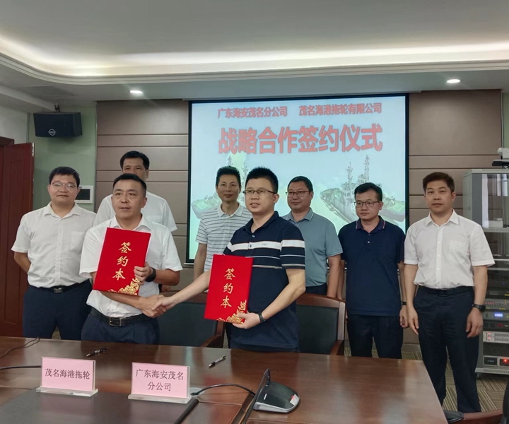 在陳雄和王金山共同見證下,茂名海港拖輪公司總經(jīng)理羅通林與廣東海安茂名分公司總經(jīng)理王沖分別代表雙方簽約。