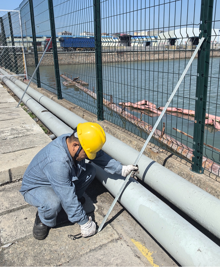 碼頭之間周界圍擋是安全管控的重要屏障,也是港口設(shè)施保安工作重要設(shè)施之一。按外委維修方案,需整體制作圍擋,費(fèi)用約8萬元。 “能不能自己干?!”黨員維修組現(xiàn)場測量圍擋尺寸,設(shè)計(jì)“鋼管立柱+鋼絲網(wǎng)格+防撞條”的簡易圍擋方案,反復(fù)論證可行性后,決定擼起袖子自己干!為確保穩(wěn)固性,黨員維修組用水平儀一米一米測標(biāo)高,用扳手一顆一顆緊螺栓;為防臺風(fēng)天氣傾倒,把鋼管底部焊接在混凝土基座,用水平尺校準(zhǔn)“毫米級”垂直度。5天的連續(xù)作業(yè),為港口經(jīng)營公司周界圍擋起整齊牢固的“安全防線”。